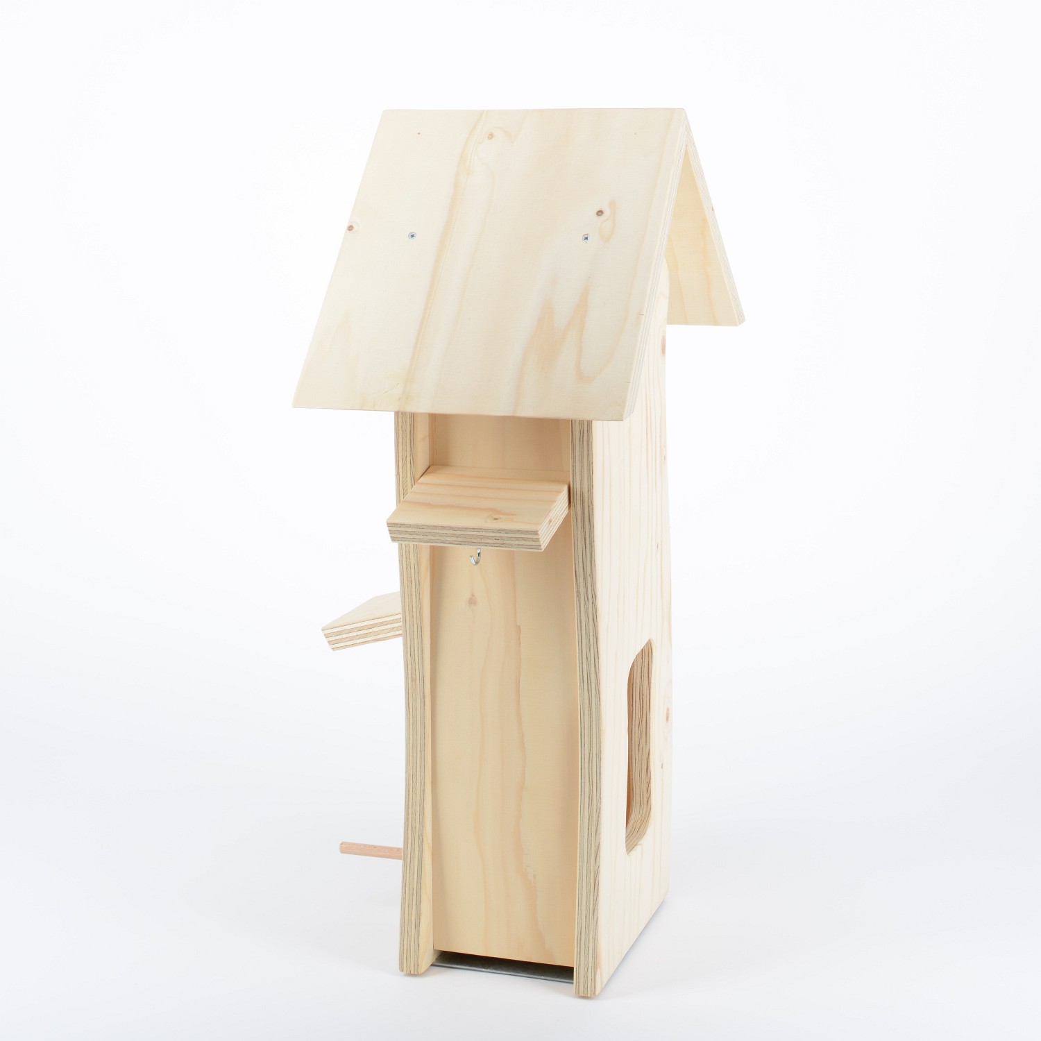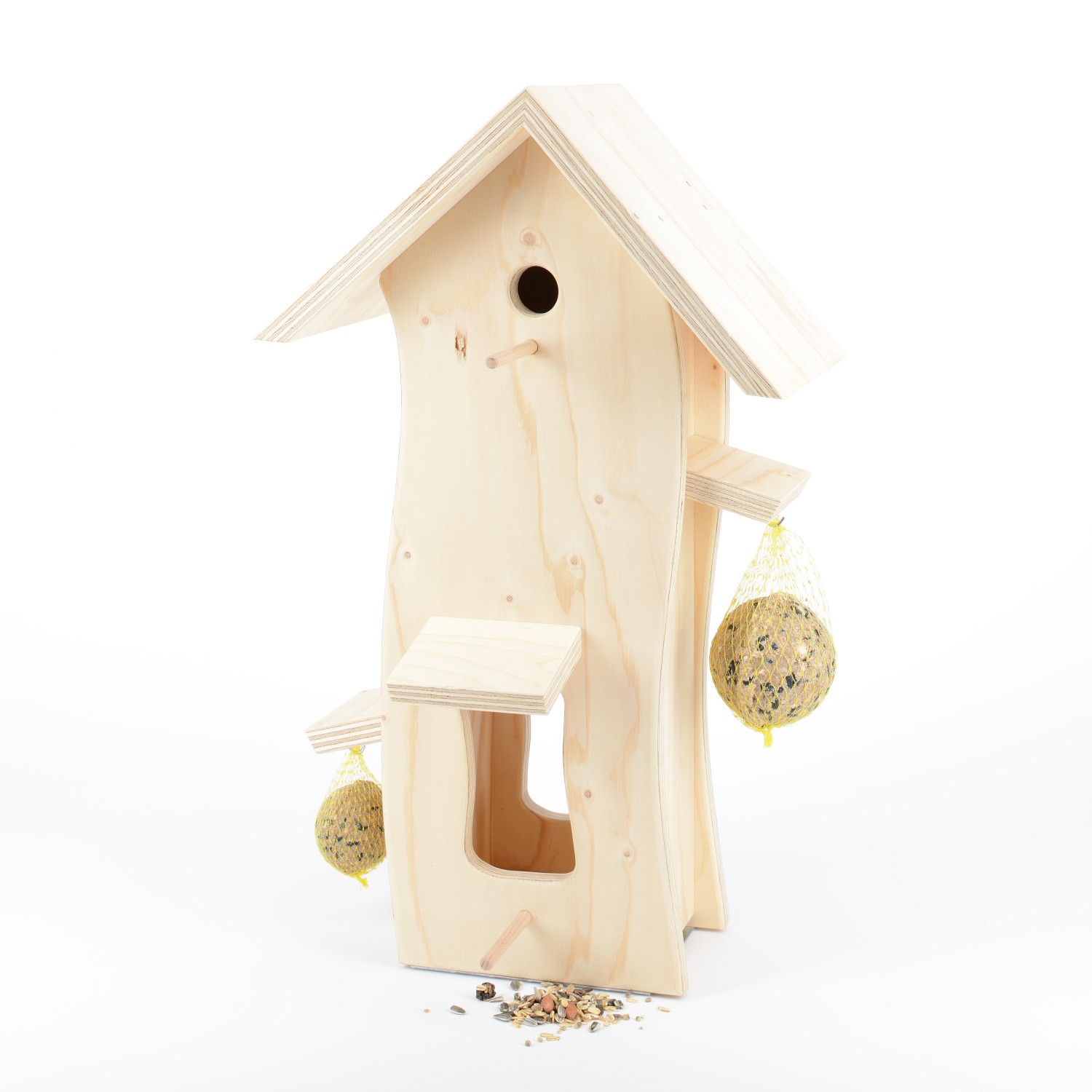 Die Vogelvilla ist ein dekoratives Vogelfutterhaus für Garten, Balkon und Terrasse. Die mehrstöckige Vogelvilla wird aus unbehandeltem finnischem Nadelsperrholz hergestellt, wobei die einzelnen, geschliffenen Holzteile fest miteinander verschraubt sind.